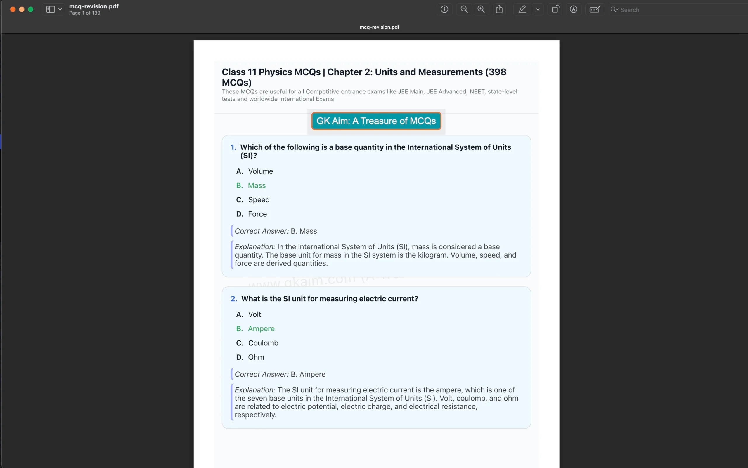 - 1) PDF (139 pages) — 398 MCQs with answers and detailed explanations, formatted for quick revision and easy printing.
